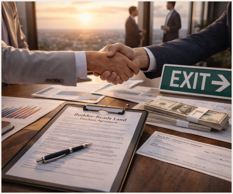 Back Bay’s exit strategy is designed around selling entitled, builder-ready land to national and regional homebuilders actively seeking de-risked residential sites.